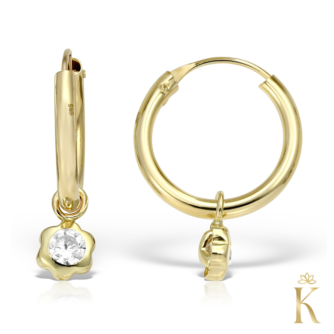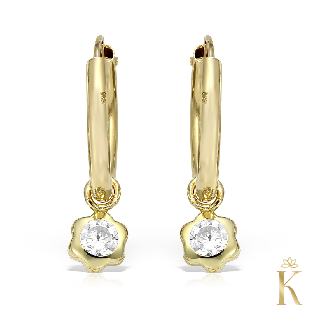 KALINI Cercei aur galben 14K, Tortite 10 mm cu pandantiv floare zirconia 4 mm
